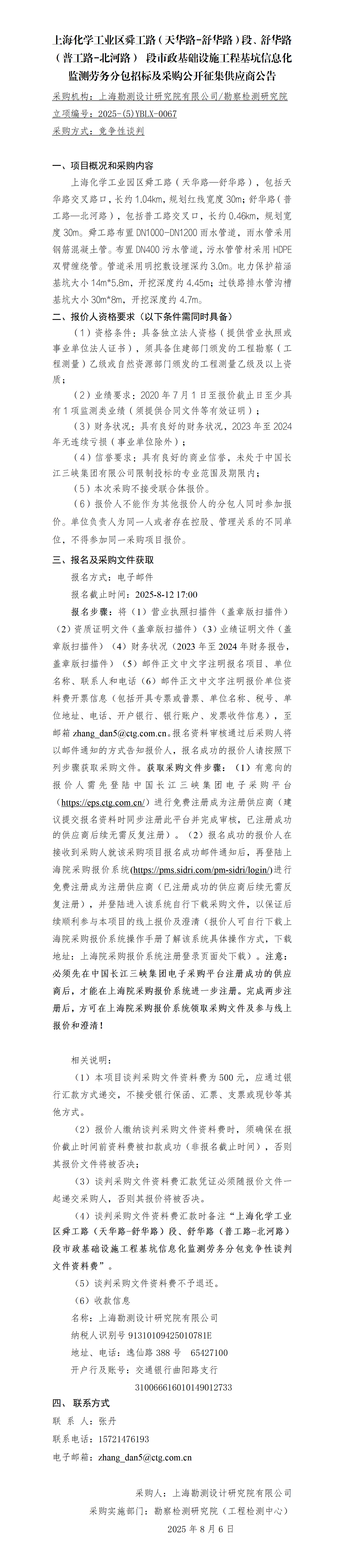 上?;瘜W工業區舜工路(天華路-舒華路)段、舒華路(普工路-北河路) 段市政基礎設施工程基坑信息化監測勞務分包招標及采購